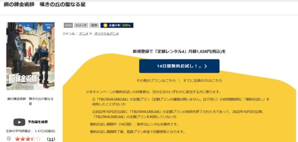 そして、映画「鋼の錬金術師 嘆きの丘(ミロス)の聖なる星」はツタヤディスカスで配信しているので、無料でDVDレンタルが可能です。
