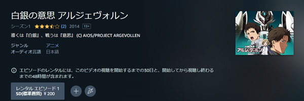 「白銀の意思 アルジェヴォルン」のアニメのレンタル料金は1話275円です。
