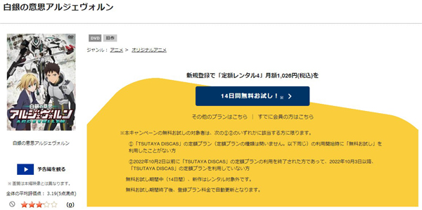 TSUTAYA DISCASは、準新作は8枚まで、話題作・旧作は枚数制限なしでお試し期間中に無料レンタルができ「白銀の意思 アルジェヴォルン」のアニメは、旧作なので無料視聴可能です。