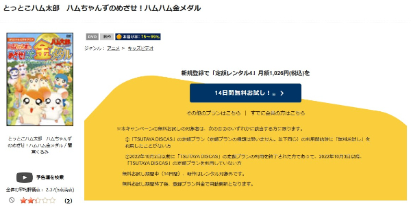 TSUTAYA DISCASは、準新作は8枚まで、話題作・旧作は枚数制限なしでお試し期間中に無料レンタルができ「ハムちゃんずのめざせ! ハムハム金メダル 〜はしれ! はしれ! だいさくせん!〜」のアニメは、旧作なので無料視聴可能です。