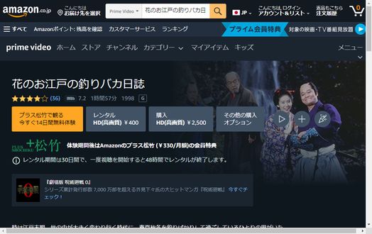 人気の動画配信サービスのAmazonプライムビデオで映画「花のお江戸の釣りバカ日誌」の映画がフルで視聴できるか調査しました。