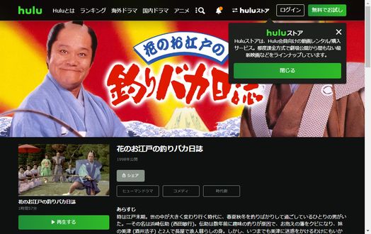 Huluでは、ブラウザでもアプリでも無料で視聴可能なので家でも外でも「花のお江戸の釣りバカ日誌」の動画をフルで楽しむことができます!