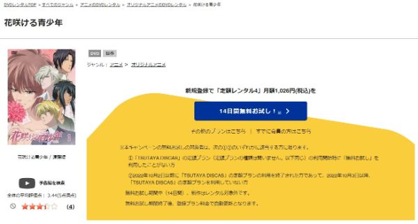 TSUTAYA DISCASは、準新作は8枚まで、話題作・旧作は枚数制限なしでお試し期間中に無料レンタルができ「花咲ける青少年」のアニメは、旧作なので無料視聴可能です。