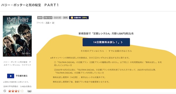 そして、映画「ハリー・ポッターと死の秘宝PART1」はツタヤディスカスで配信しているので、無料でDVDレンタルが可能です。