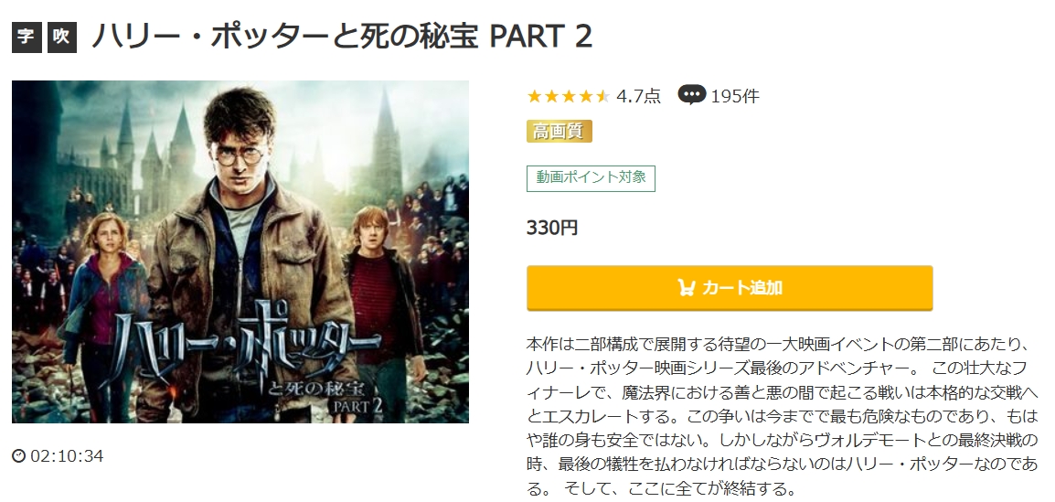 初回登録時に1,600円分のポイントがもらえるので、330ポイントでレンタル配信している映画「ハリー・ポッターと死の秘宝PART2」はフルで視聴できます。