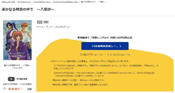TSUTAYA DISCASは、準新作は8枚まで、話題作・旧作は枚数制限なしでお試し期間中に無料レンタルができ「遙かなる時空の中で-八葉抄-」のアニメは、旧作なので無料視聴可能です。