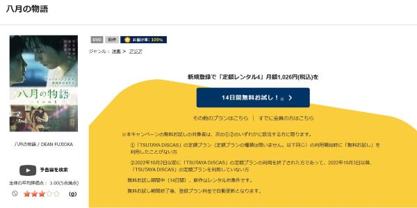 そして、映画「八月の物語」はツタヤディスカスで配信しているので、無料でDVDレンタルが可能です。