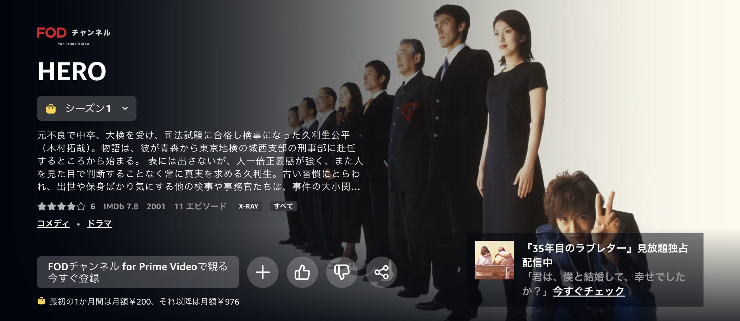 Amazonプライムでも、ドラマ「HERO」シリーズを配信しているか調査しました。