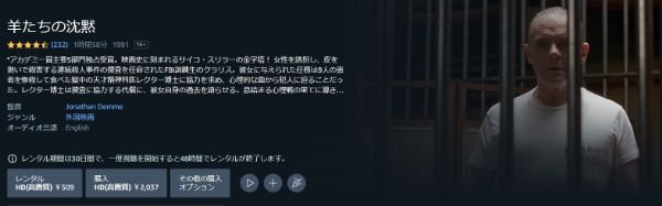 映画「羊たちの沈黙」はAmazonプライムビデオでもフルで視聴することができます。