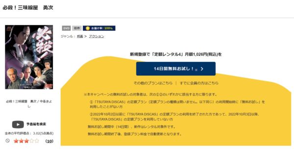 そして、映画「必殺! 三味線屋・勇次」はツタヤディスカスで配信しているので、無料でDVDレンタルが可能です。