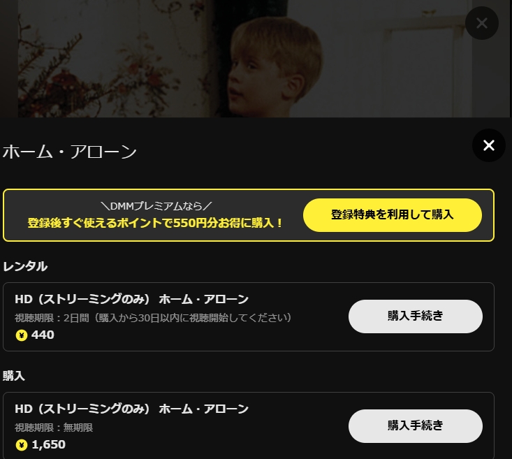 映画「ホーム・アローン」はレンタル作品のため440円必要ですが、DMM TV初回登録でもらえる550ポイントを利用すれば、実質無料でレンタルできます。