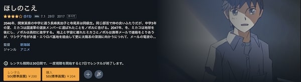 しかし、Amazonプライムビデオは無料期間が30日間ありますが、「ほしのこえ」の映画はレンタル作品で200円かかってしまうため無料視聴することができません。