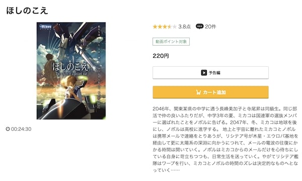 映画「ほしのこえ」はレンタル作品なので視聴するのに220円かかりますが、初回特典で600Ptが貰えます。