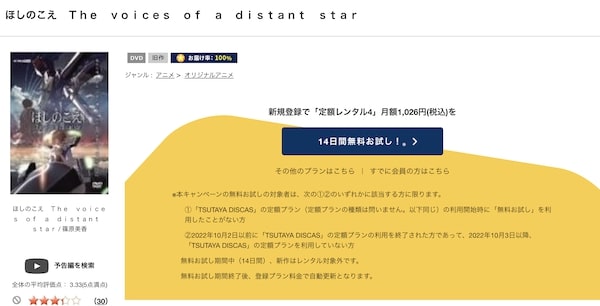 そして、映画「ほしのこえ」はツタヤディスカスで配信しているので、無料でDVDレンタルが可能です。