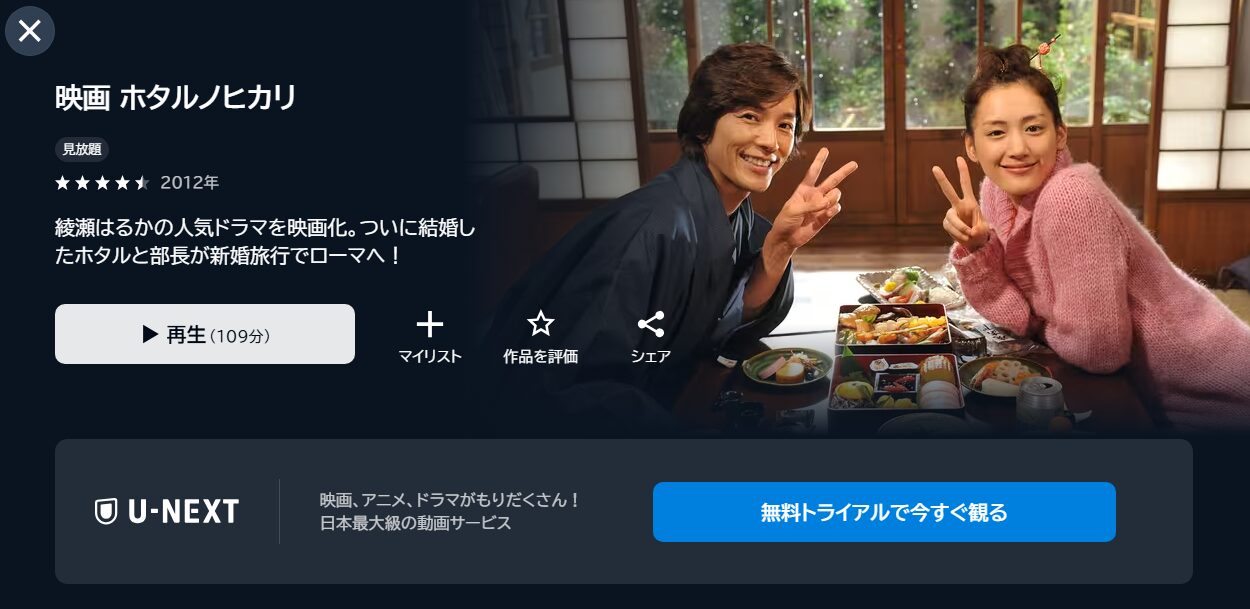 よりお得に見たいという方には、初回31日間の無料トライアルがあるU-NEXTがおすすめです。無料期間を利用すれば、追加料金なしで映画「ホタルノヒカリ」を楽しめますよ。