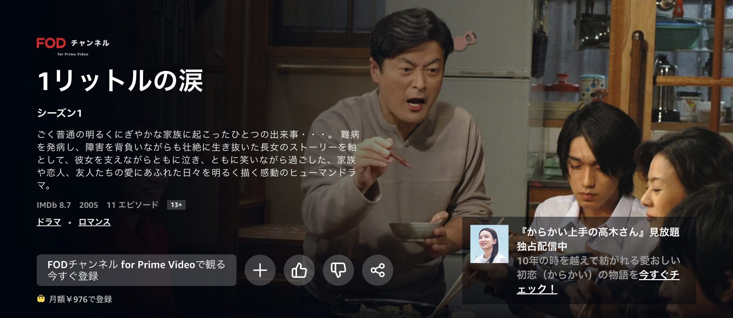 ただし注意点として、FODチャンネル for Prime Videoには無料トライアルがないため、「1リットルの涙」を完全無料で視聴することはできません。