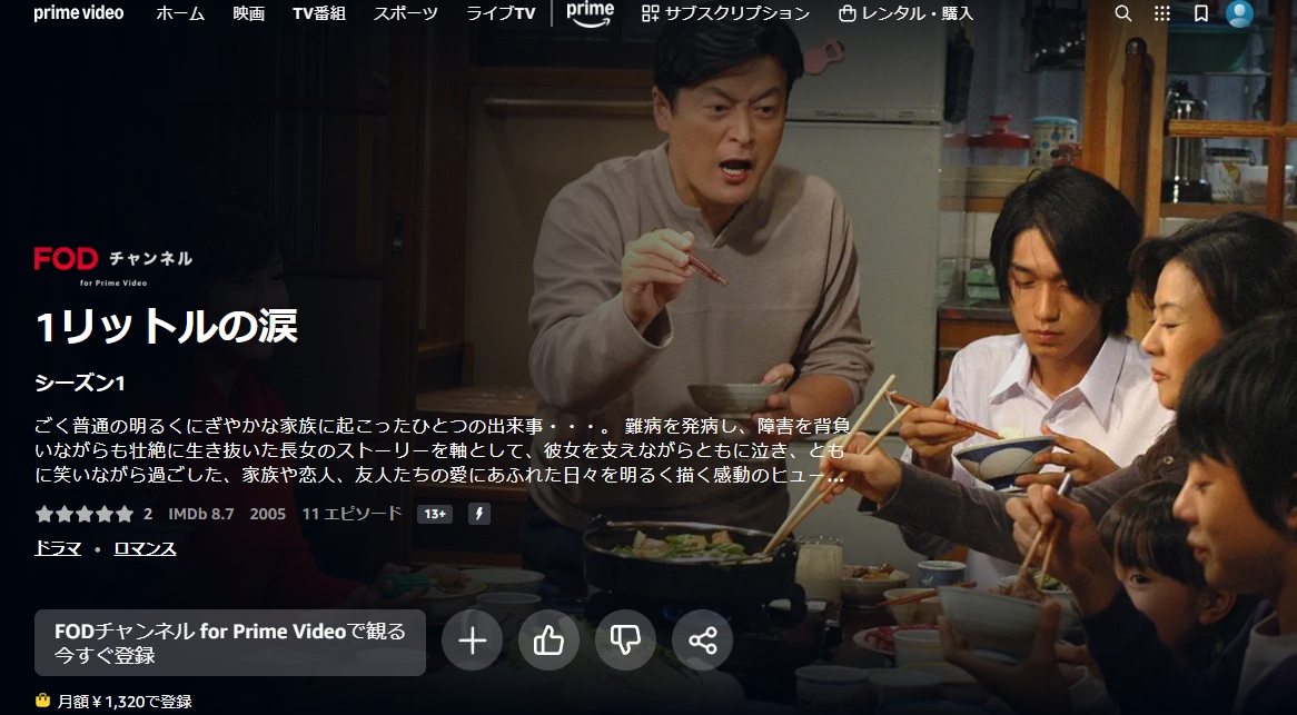 Amazonプライムではドラマ「1リットルの涙」の配信はありませんが、追加チャンネルの「FODチャンネル for Prime Video」に登録すると、全話見放題で視聴可能です。