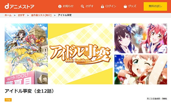 またdアニメストアは、アニメ「アイドル事変」のシリーズや関連動画を全話視聴できます。