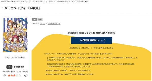 TSUTAYA DISCASは、準新作は8枚まで、話題作・旧作は枚数制限なしでお試し期間中に無料レンタルができ「アイドル事変」のアニメは、旧作なので無料視聴可能です。