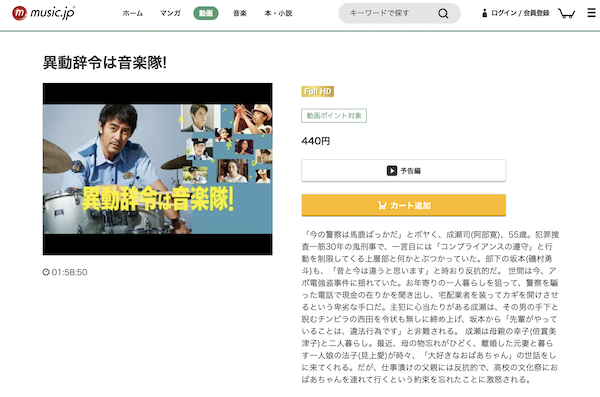 music.jpは、初回登録で1,600Ptが貰えるので「異動辞令は音楽隊!」の映画を無料で見ることができます。