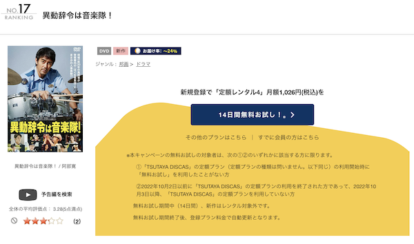 TSUTAYA DISCASの定額4プランのお試し期間中であれば、準新作〜旧作のDVDを4枚まで無料レンタルができるので、「異動辞令は音楽隊!」は新作で無料レンタルされていませんが、関連作品でしたら無料レンタルすることができますよ。