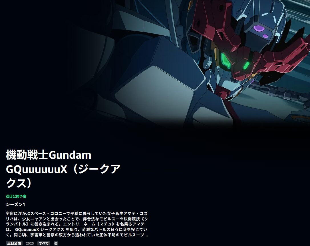 Amazonプライムでアニメ「機動戦士Gundam GQuuuuuuX」の動画を全話無料視聴