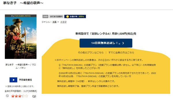 『TSUTAYA DISCAS』は14日間のお試し期間が初回特典で利用できるので「家なき子 希望の歌声」の動画をフルで無料視聴できますよ。