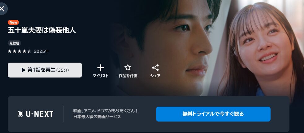 先に結論をお伝えすると、「五十嵐夫妻は偽装他人」は、『U-NEXT』の動画配信サイトで無料トライアル期間中に全話視聴が可能です。