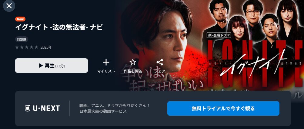 先に結論をお伝えすると、「イグナイト -法の無法者-」は、『U-NEXT』の動画配信サイトでトライアル期間中に全話見放題配信中です。