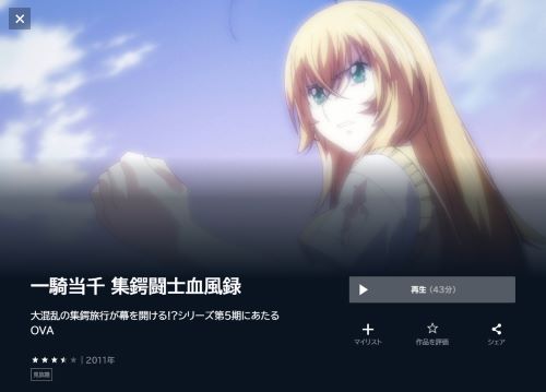 ただ、アニメ「一騎当千 集鍔闘士血風録」の関連作品やシリーズ作品は配信しているので、有料となってしまいますが見放題で視聴は可能です。