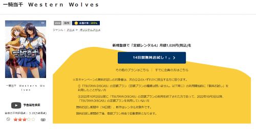 TSUTAYA DISCASは、準新作は8枚まで、話題作・旧作は枚数制限なしでお試し期間中に無料レンタルができ「一騎当千 Western Wolves」のアニメは、旧作なので無料視聴可能です。