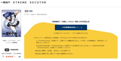 TSUTAYA DISCASは、準新作は8枚まで、話題作・旧作は枚数制限なしでお試し期間中に無料レンタルができ「一騎当千 XTREME XECUTOR」のアニメは、旧作なので無料視聴可能です。