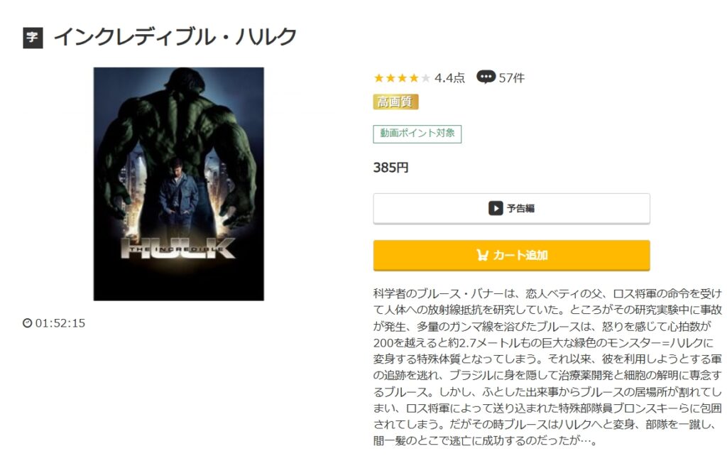 初回登録時に1,600円分のポイントがもらえるので、385ポイントでレンタル配信している映画「インクレディブル・ハルク」は無料で視聴できます。