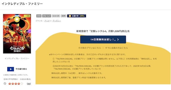 ツタヤディスカスは、準新作・話題作・旧作が4枚までなら、無料お試し期間中にレンタルができるので、「インクレディブル・ファミリー」の映画を無料で視聴した後も14日間以内なら他のシリーズ作品や見たかった映画も無料でレンタルすることができますよ。