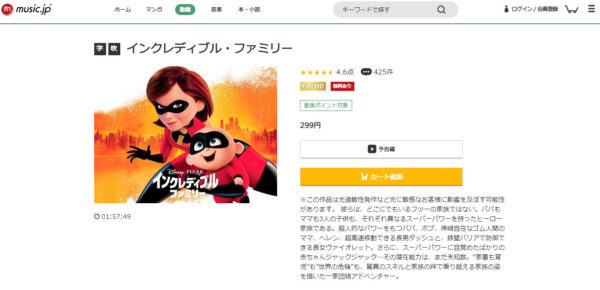初回登録のみmusic.jpでは1,600Ptが貰えるので「インクレディブル・ファミリー」の映画をフルで見ることができます。