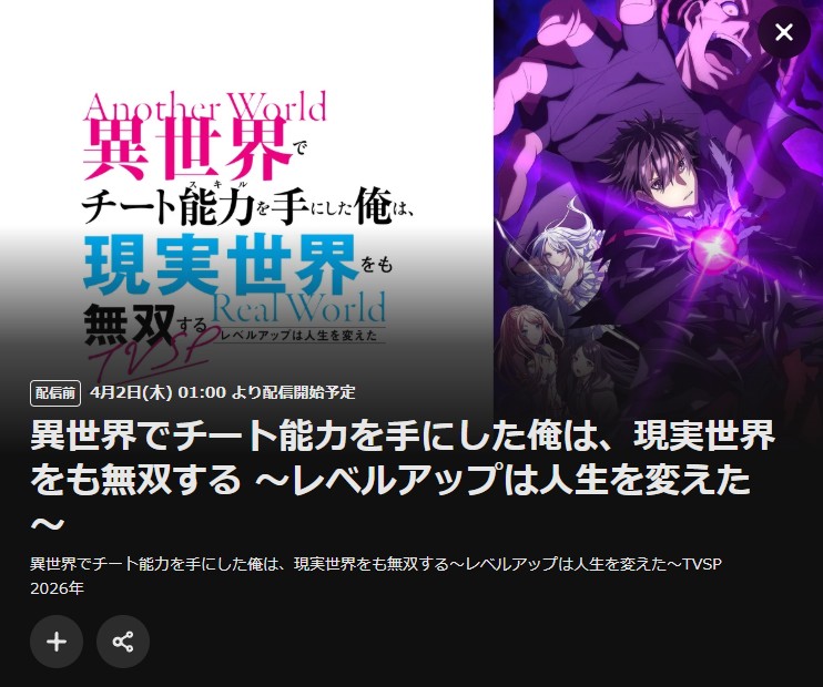 是非、この機会にU-NEXTでTVSPアニメ「異世界でチート能力を手にした俺は、現実世界をも無双する ~レベルアップは人生を変えた~」をご覧になってみてください!