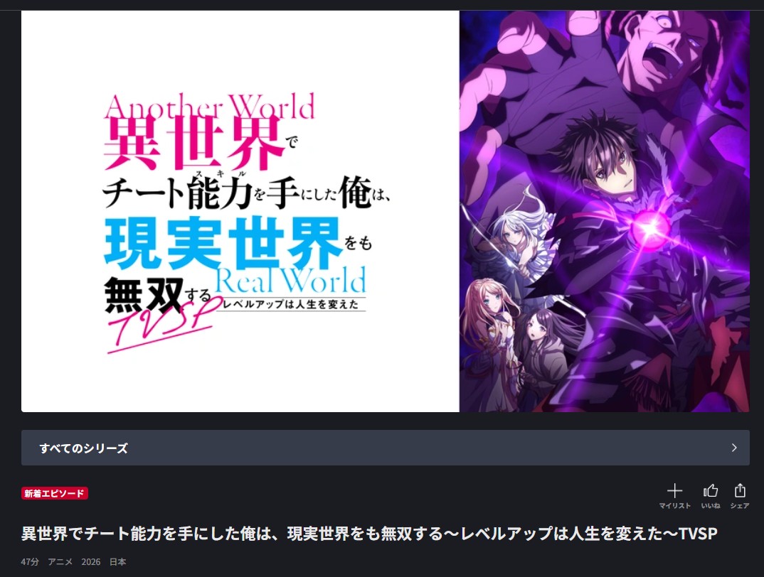 以上、TVSPアニメ「異世界でチート能力を手にした俺は、現実世界をも無双する ~レベルアップは人生を変えた~」の配信についてご紹介しました。