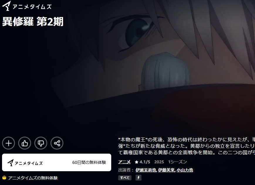 「異修羅 2期」のアニメを1期からまとめて楽しみたい!という方はぜひ登録することをおすすめします。