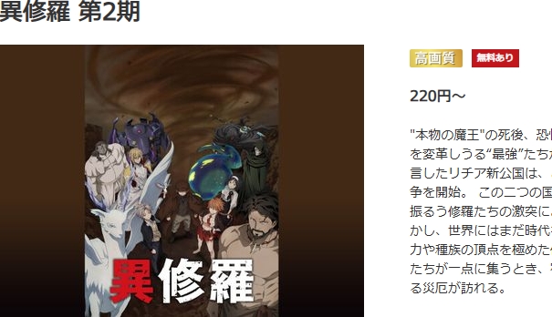 2026年3月現在、DMM TVではアニメ「異修羅 2期」の動画が全話見放題で配信中です。