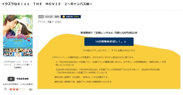 そして、映画「イタズラなKiss THE MOVIE Part2 キャンパス編」はツタヤディスカスで配信しているので、無料でDVDレンタルが可能です。