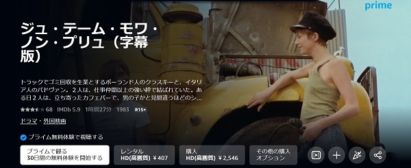 映画「ジュ・テーム・モワ・ノン・プリュ」はAmazonプライムビデオでもフルで視聴することができます。