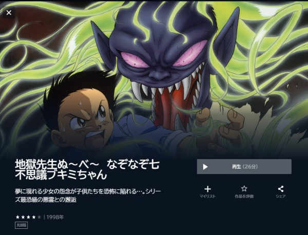 ただ、アニメ「地獄先生ぬ〜べ〜 なぞなぞ七不思議・ブキミちゃん」の関連作品やシリーズ作品は配信しているので、有料となってしまいますが見放題で視聴は可能です。