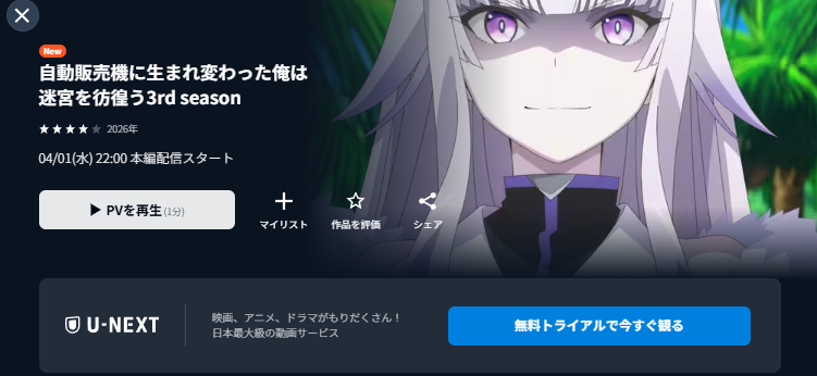 先に結論をお伝えすると、アニメ「自動販売機に生まれ変わった俺は迷宮を彷徨う 3rd season」は動画配信サービス『U-NEXT』で配信予定です。