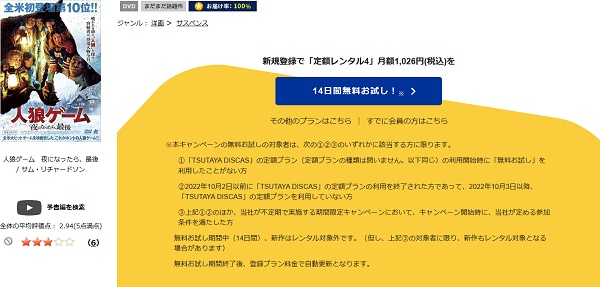 ツタヤディスカスは、準新作・話題作・旧作が8枚までなら、無料お試し期間中にレンタルができるので、「人狼ゲーム 夜になったら、最後」の映画を無料で視聴した後も30日間以内なら他のシリーズ作品や見たかった映画も無料でレンタルすることができますよ。