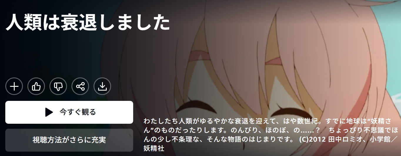 2026年3月現在、DMM TVではアニメ「人類は衰退しました」が配信中です。