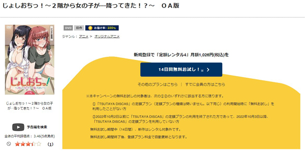 TSUTAYA DISCASは、準新作は8枚まで、話題作・旧作は枚数制限なしでお試し期間中に無料レンタルができ「じょしおちっ!~2階から女の子が…降ってきた!?~」のアニメは、旧作なので無料視聴可能です。