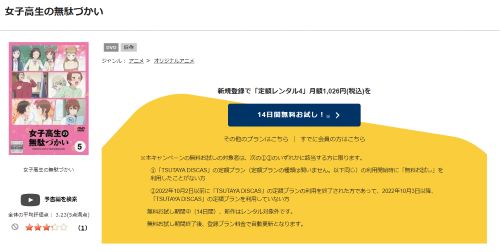 TSUTAYA DISCASは、準新作は8枚まで、話題作・旧作は枚数制限なしでお試し期間中に無料レンタルができ「女子高生の無駄づかい」のアニメは、旧作なので無料視聴可能です。