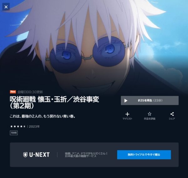 残念ながら無料のお試し期間はありませんが、アニメ「呪術廻戦」シリーズを全話見ることができます。