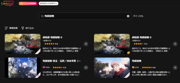 Leminoで、アニメ「呪術廻戦」のシリーズの配信状況は以下になります。