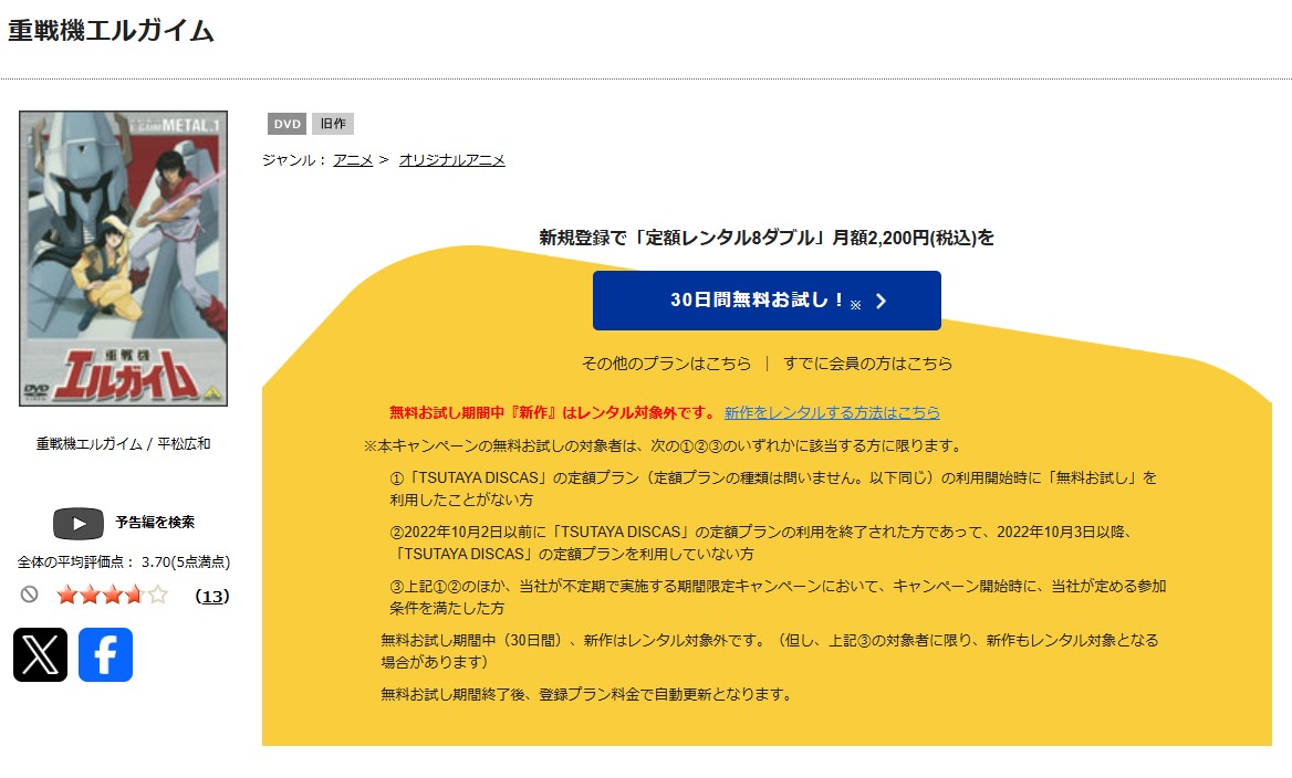 アニメ「重戦機エルガイム」は旧作で、全54話合わせてDVD9枚分なので、8枚まで追加料金なしで視聴可能です。